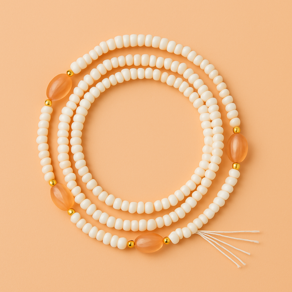 Elevate your energy with Heavenly Glow — a luminous strand featuring pure white beads accented with golden details and soft peach-toned ovals that shimmer like pearls. This strand embodies peace, clarity, and radiance. Whether you're manifesting purity or stepping into your divine softness, this piece adds a graceful glow to your waistline.
