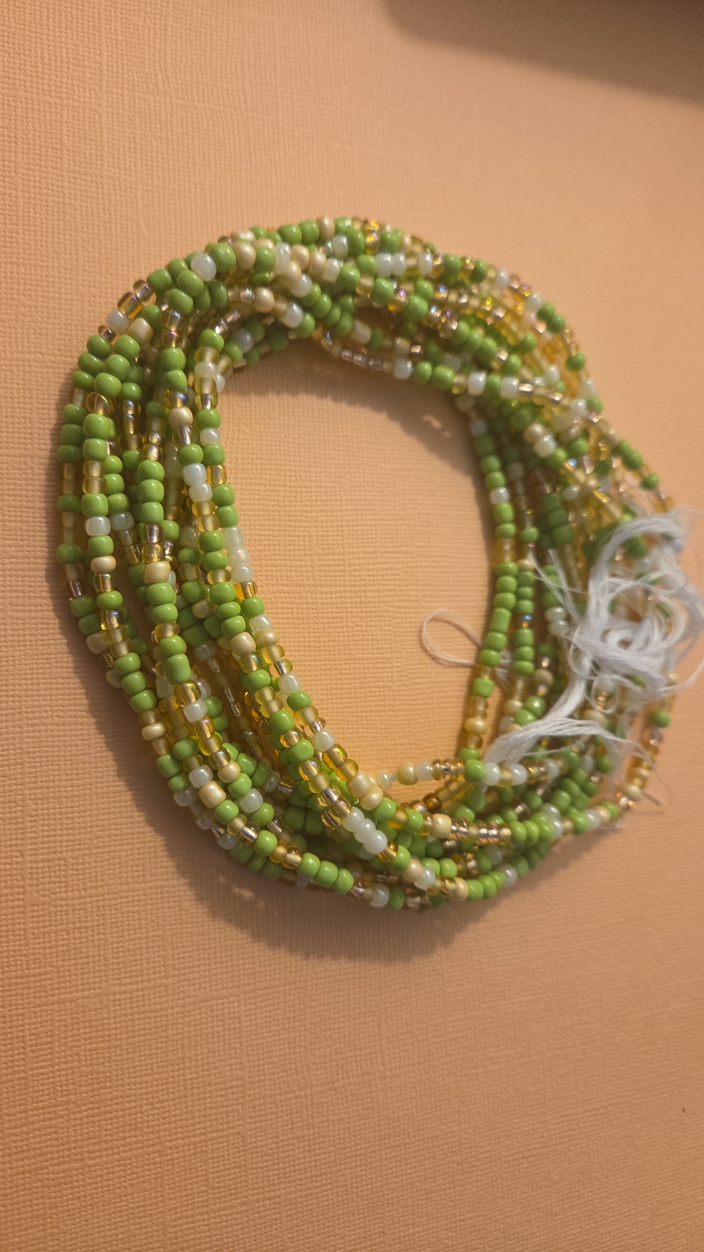 Step into harmony with Meadow Glow, a lush strand of green beads blended with golden shimmer, pearly whites, and clear accents. Green symbolizes growth, healing, and prosperity, while gold radiates abundance and power. The pearly touches bring grace and clarity, making this waistbead a celebration of renewal and feminine balance. A strand for the woman blossoming in her own divine season. πΏβ¨π