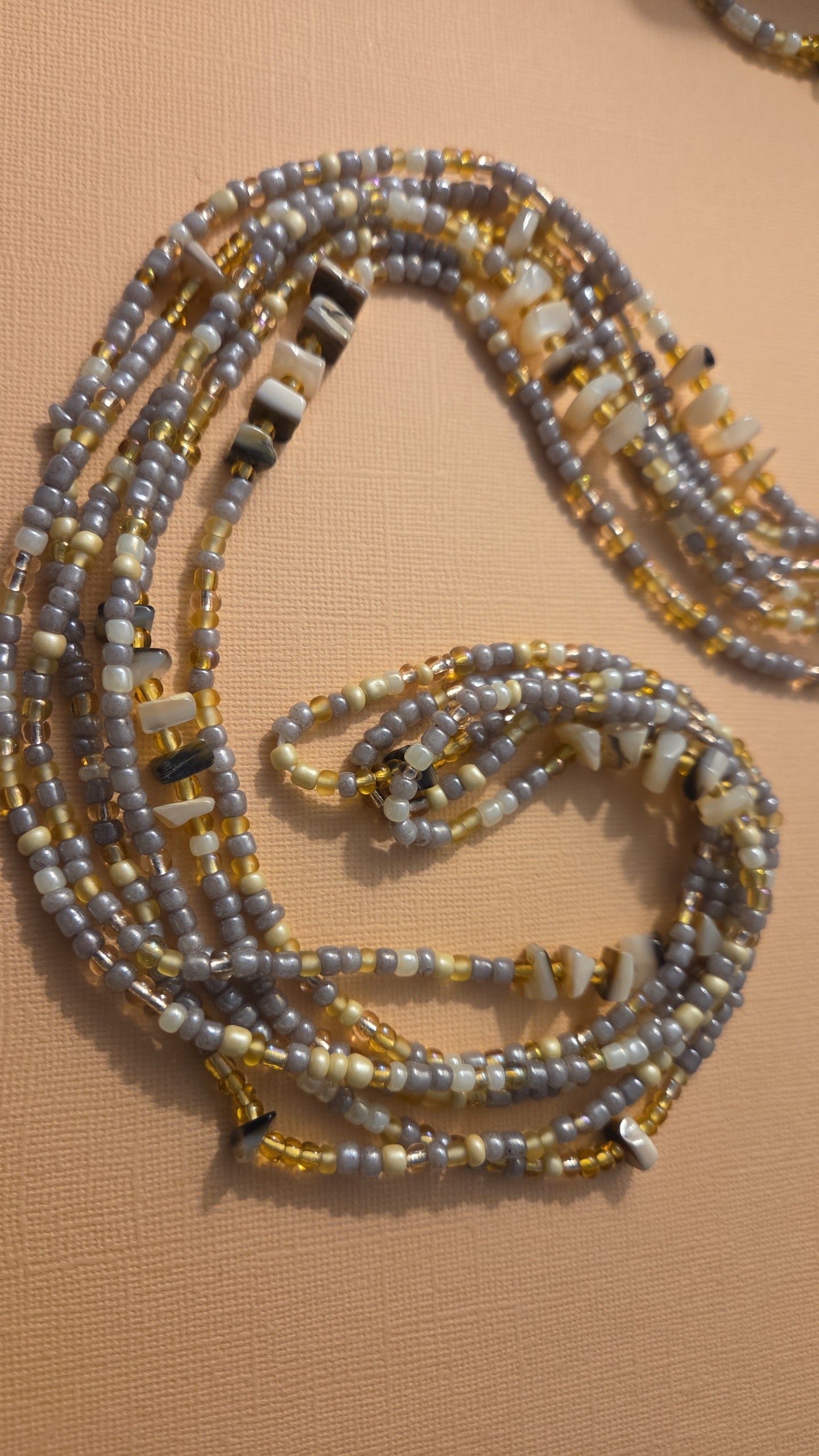 Illuminate your aura with the Moonlit Glow Waistbead, a delicate blend of soft grays, ivory, and golden accents. Inspired by the calm beauty of moonlight against a night sky, this strand is perfect for setting intentions of clarity, peace, and radiant self-love. The golden beads bring warmth and abundance, while the subtle neutral tones keep it grounded and versatile.