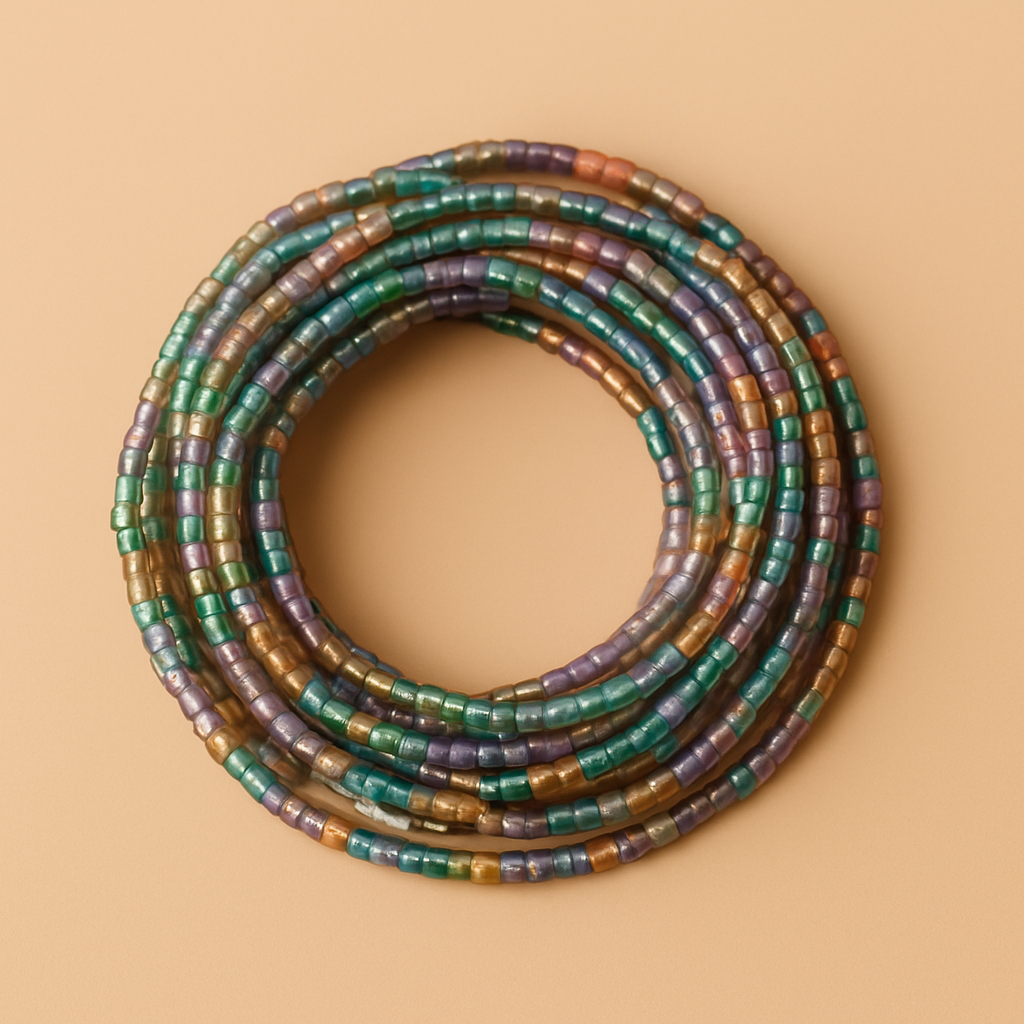 Mystic Moss is a grounded beauty with a magical twist. Blending muted turquoise-greens, earthy golds, and smoky lilac tones, this strand glows with a soft iridescence that catches light and attention. Perfect for channeling balance, mystery, and a touch of sass, she’s giving regal forest enchantress meets urban goddess. Wear it when you want to feel rooted and radiant.