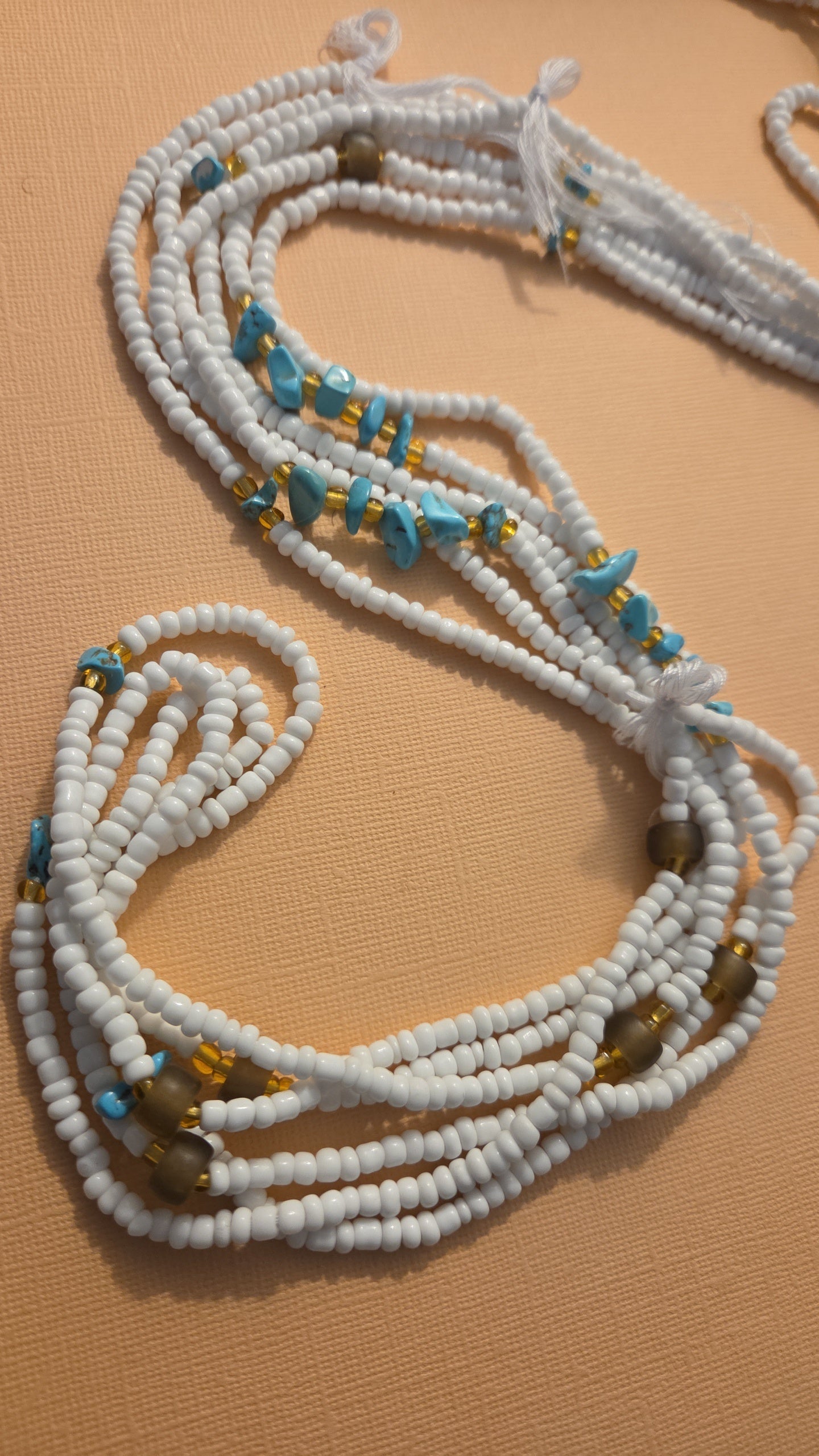 Flow in harmony with the calming strength of the sea. Ocean Serenity features a base of pure white beads, accented by turquoise stone chips for protection and clarity, gold glimmers for divine radiance, and frosted brown beads for grounding balance. This strand embodies peace, renewal, and spiritual strength — a reminder to move with grace and carry calm in every season. 🌊✨