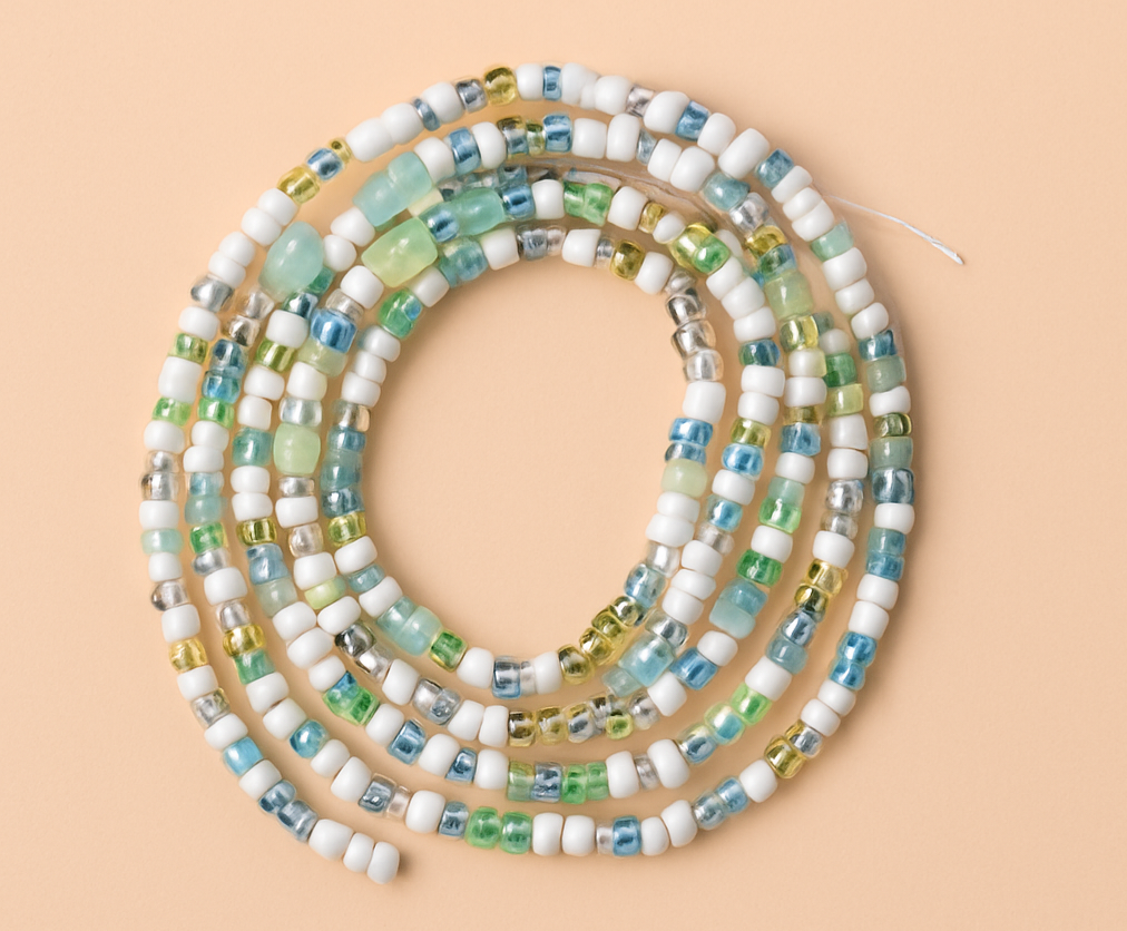 Embrace peaceful power with Snowy Meadow, a fresh blend of white, silver, icy blue, and soft green beads that shimmer with soft femininity. This strand evokes crisp air and gentle calm — a serene vibe with a subtle pop of color. Perfect for grounding your energy while standing out with effortless grace.